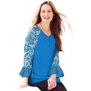 Get ready to steal the show in the top armed with beautiful drama. Let’s zoom in for a close-up. Notice the sleeves. They’re raglan cut with a flounce finish, have a pretty contrast print, and stop at a three-quarter length. We suggest pairing with our Right Fit Denim for a casual look or our Right Fit Pant for wear to work star power..