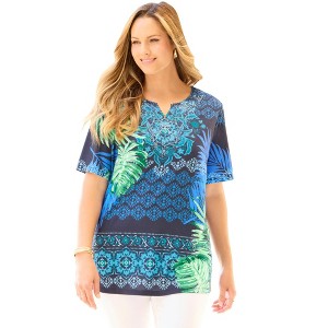 The contrasting print of this top is all about eye-catching style that can have you fashionably dressed for day or night. The neckline is embellished with charming crochet and sparkling studs for extra feminine flair.FABRIC: Super-soft and smooth knit with comfortable stretch.FIT: Relaxed, easy silhouette. Notched neck. Short sleeves..