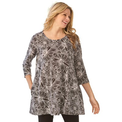 Catherines Seasonless Gauze Peasant Top - 1X, Black Sketch Floral