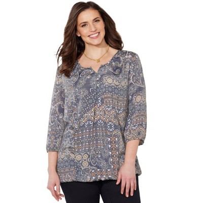 Catherines Seasonless Gauze Peasant Top - 6X, Black Sketch Floral