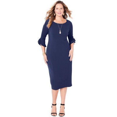 • FIT: Relaxed and flattering shift silhouette with scoop neckline and 3/4 sleeves. Bust darts and back waist dart for soft shaping. Center-back zip closure. Flounce hem.
