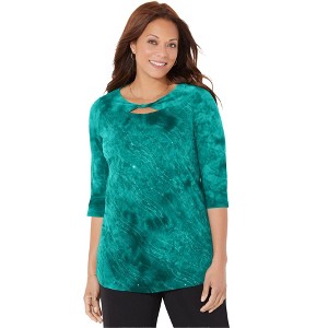 This soft, everyday tee looks instantly special with scattered sequins, Fun openwork at the neckline, and peached tie-dye print. Wear it with your favorite jeans or casual pants, and skip the top layer. This top is meant to shine on its own..