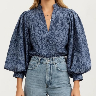 Catherines Velvet Trim Pleated Blouse - 1X, Pink Black Paisley Print