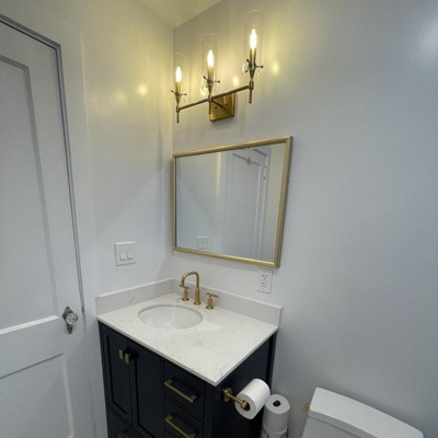 Beautiful gold light fixture! It’s hard to find gold and this checked every box for our updated small space bathroom.