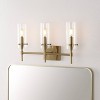 This minimalist triple wall light has crisp modern lines and a stylish brass-gold finish. This 3-light fixture is perfect for a single sink in a large bathroom; or use one over each sink on a double vanity. Replace outdated wall sconces or vanity lights with our clean-lined fixture for an instant modern makeover. Eco-friendly 4W LED bulb included. Takes 3 bulbs and compatible with TYPE "B" 40W or CFL 13W or LED 9W. Color Temperature: 2700K. CRI: 80. Before cleaning any lamp shade or fixture, disconnect the power source. Wipe with a soft, dry cloth. Avoid the use of chemicals and household cleaners as they may damage the finish.