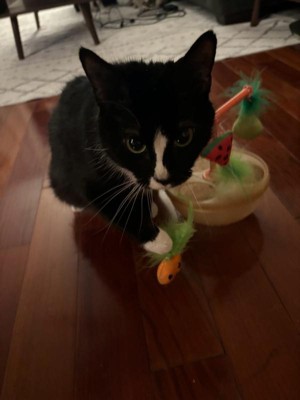 [This review was collected as part of a promotion.] This cute toy really intrigued all 3 of my cats, especially since the toys have some catnip. I like the design and how it encourages a cat to hunt in the bowl for a toy. It kept my younger cat Ollie’s interest for quite some time, I think he found his new favorite toy to play with! I highly recommend this cat toy!