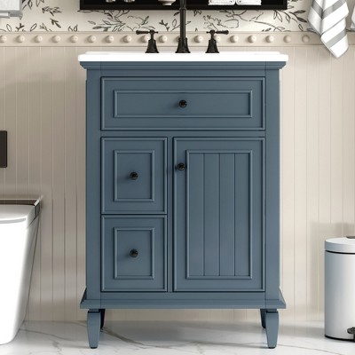 Designed for small or guest bathrooms, this compact 24-inch vanity offers full functionality while fitting seamlessly into tight spaces. It features a durable, low-maintenance ceramic sink that is scratch-resistant and includes an overflow hole and three pre-drilled faucet holes for easy installation and cleaning. The well-organized storage includes double doors with internal shelves and a divided drawer to keep toiletries and essentials neatly accessible. Constructed with a sturdy solid rubberwood frame and MDF panels enhanced by hand-painted craftsmanship, it ensures durability, stability, and a refined finish. User-friendly features such as soft-close hinges, sleek silver handles, protective plastic feet, and a spacious interior provide quiet operation, scratch protection, and straightforward two-person assembly.