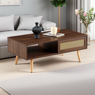 CAVINAS 41.34 Inch Modern Rattan Coffee Table for Living Room,Rectangle Center Table with Sliding Door