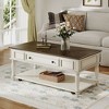 CAVINAS Farmhouse Coffee Table,Tea Table with Lockable Wheels,1 Drawer,Open Shelf,Solid Wood Legs,Rectangular Cocktail Table for Living Room