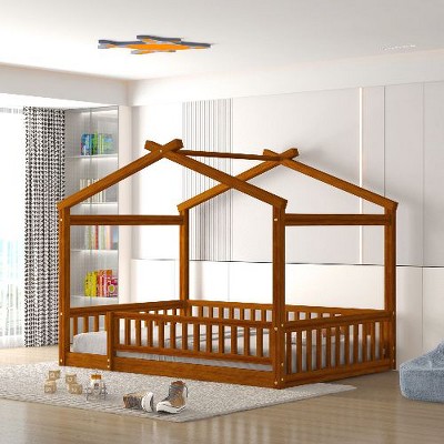 Product Name: CAVINAS Full Size House Bed Frame with High Fence,Modern Floor Bed for Kids Room,Bedroom,Walnut