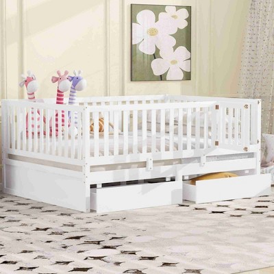 CAVINAS Full Size Wood Montessori Bed,Modern Floor Bed with House-Shaped Headboard and Handrails,Toddler Bed for Bedroom,White
