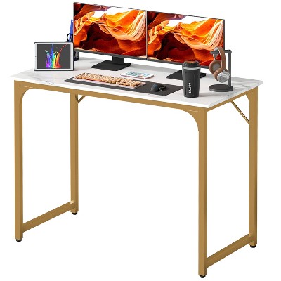 Product Name: CAVINAS Industrial Computer Desk with Two-Tier Shelf, Modern Writing Desk with Mobile CPU Caddy, Office Desk for Bedroom, Home Office, Gold+White