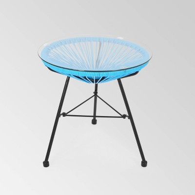Enhance your outdoor space with this modern polyethylene rattan patio side table, featuring a sleek circular top and thin angled legs for a minimalist look. The hand-crafted woven rattan base adds texture and durability, seamlessly blending with any outdoor decor. Topped with a tempered glass surface, this outdoor table offers a smooth, shatter-resistant platform for drinks, snacks, or decor. Measuring 17.75"W x 18"H, it’s the perfect patio end table for poolside lounges or patio seating areas. Though assembly is required, all tools and instructions are included, ensuring you can quickly enjoy its stylish functionality.