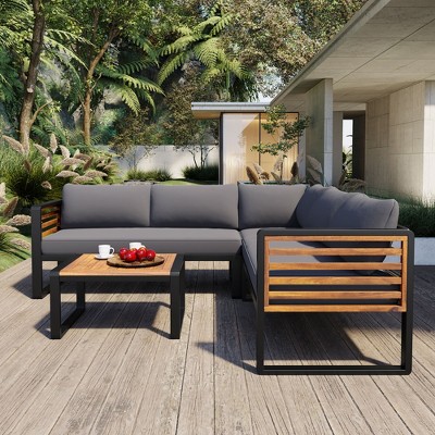 CAVINAS Patio Sectional Set, Acacia Patio Couch Set, Modern Waterproof Outdoor Couch Set with Cushions for Garden, Gray