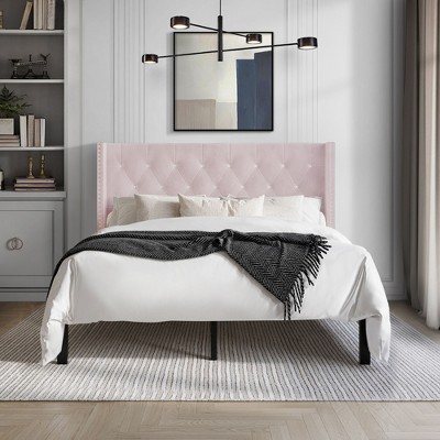 Product Name: CAVINAS Queen Upholstered PU Bed Frame,Platform Bed Frame with Butterfly Shaped Headboard and Footboard,Sturdy Platform Bed for Bedroom,Light Pink