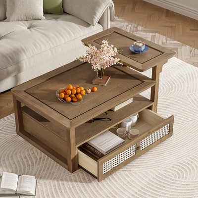 CAVINAS Rustic Modern Coffee Table with 2 Tabletops,1 Shlef&1 Rattan Drawer,Farmhouse Accent Center Table for Living Room,25lbs Max,Yellow