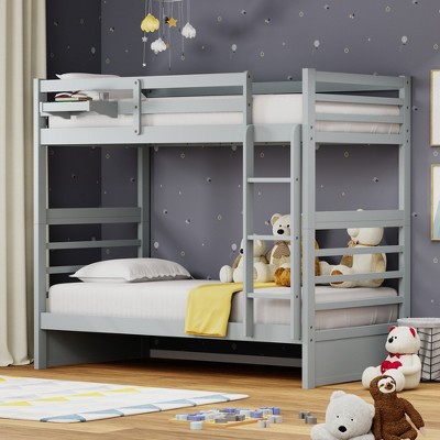 CAVINAS Twin Over Twin Rubber Wood Floor Bunk Bed with Ladder & Guardrails,House Bed Frame for Kids Room,Light