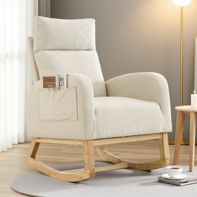 CAVINAS Wood Rocking Chair, Teddy Fabric Accent Chair with Side Pocket, High Back Reading Chair for Bedroom, Living Room, Beige