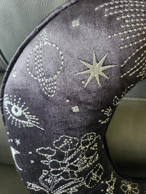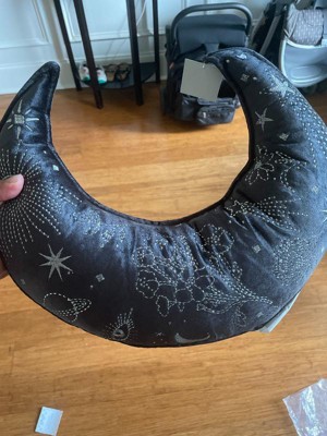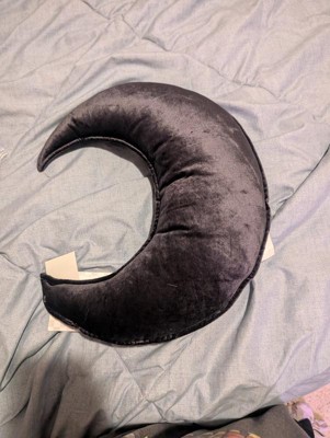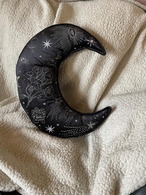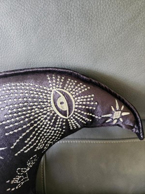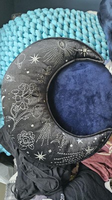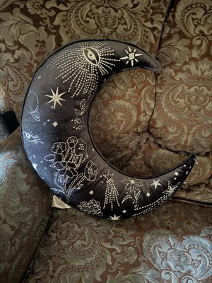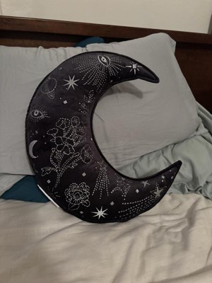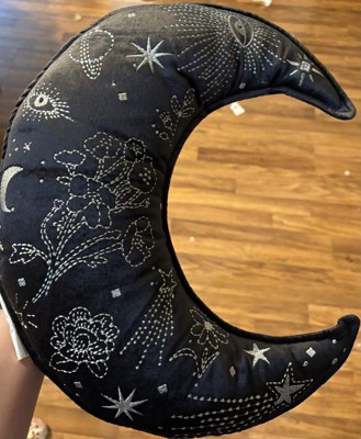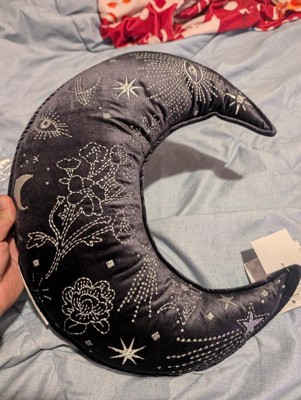 The celestial garden embroidered crescent moon pillow is such a vibe. It has a unique and beautiful design, which is suitable for adults and younger people alike. The material is a soft velvet, in the color black and the embroidery is a metallic silver.