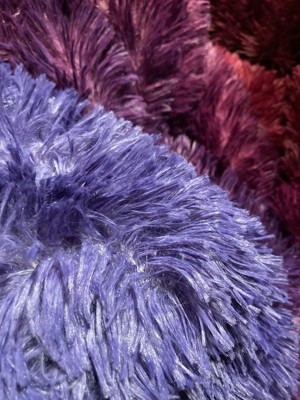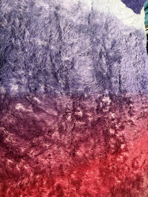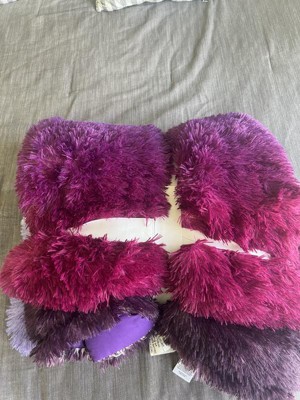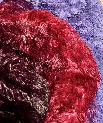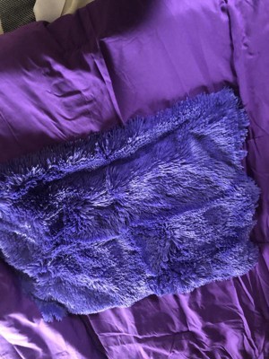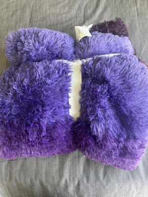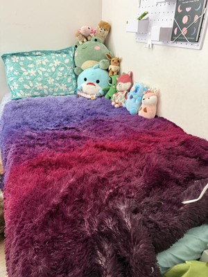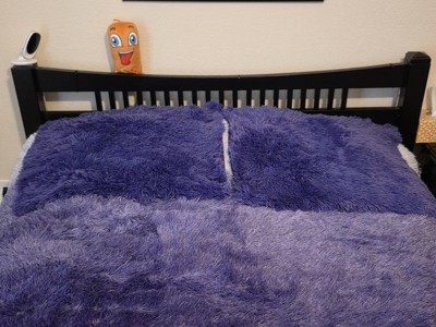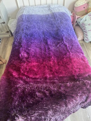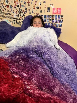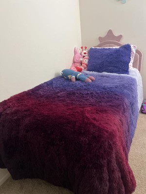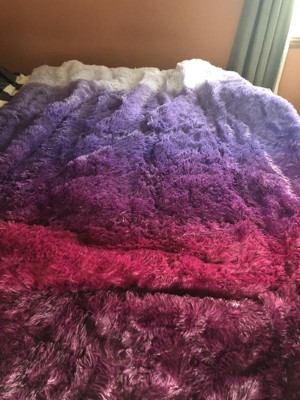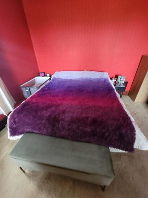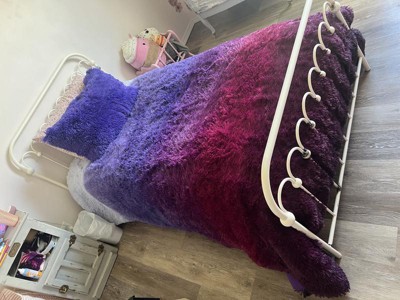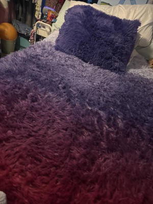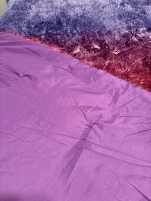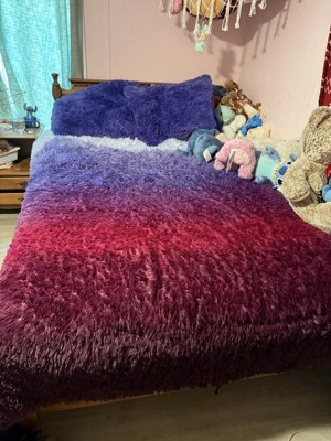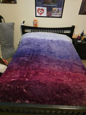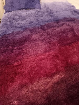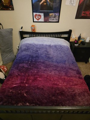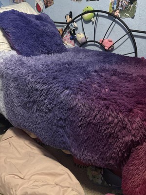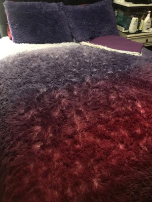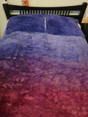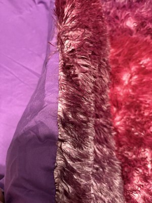 My teenage daughter loves this comforter so much. She says it’s so cozy! It’s ombré so it goes from a light light purple down to a blood red color. The reverse side is solid purple and to me, not very soft. The fur side is soft. What I don’t like about it is that the “root” of the fur is white. So it almost makes the comforter look like it’s balding and the white is the fabric showing through. It does shed a little, but nothing major. But again, my teenage daughter, absolutely loves it.