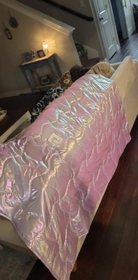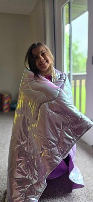 This is such a fun blanket! It is very shiny on one side and a flat light purple on the other side. It is the perfect size for a kid-it can be used as a throw blanket, a cape, or a shiny roof for a fort!