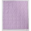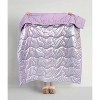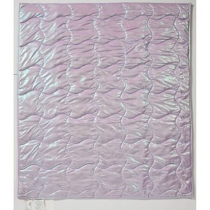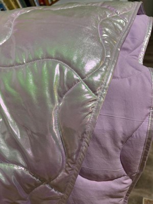 This is a super cute quilted throw! The sparkling purple metallic color is really pretty. The fabric is soft and has a nice texture. This throw blanket is perfect for your bed, or on the couch. It is a nice size, perfect for young girls. The quality seems good.