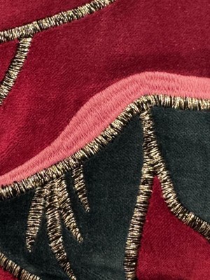 This decorative throw pillow is gorgeous. The colors are deep and rich. The fabric is soft, luxe velvet. The stitching is silver and black. The lighter pink is stitched. The pillow is filled with polyester fiber that is fairly dense, so the pillow willhold it's shape with use. Overall, it is a striking accent pillow for a touch of glamour and seems very well made.