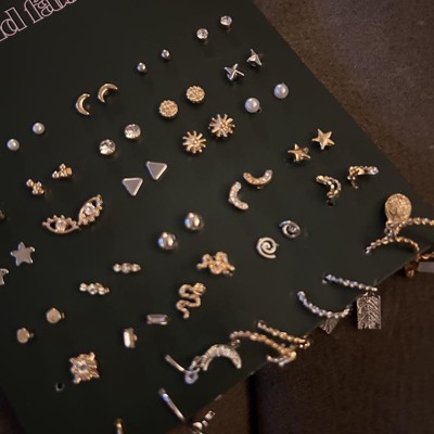 [This review was collected as part of a promotion.] I purchased this package of earrings online. This variety multipack of earrings comes with 30 pairs. There are 25 pairs of studs and 5 pairs of hoop earrings. Each pair is unique and come in shades of gold and silver metal. These are not real gold or silver and should not be worn by someone who has a metal allergy. I do like how much variety this pack offers. You could honestly wear a different pair every day of the month. My favorite are the evil eye and the crescent moon. The hoops are very small and dainty. For the price, this is a good value because you get so many. I received an incentive to write this review.