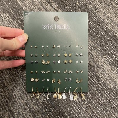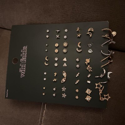 30-pair earring set from Wild Fable™ features a mix of celestial-themed stud and hoop earrings, all with gold or silver finishes. Includes assorted designs such as stars, moons and more. Made of nickel-free metal with post-back closures for comfortable and secure wear.