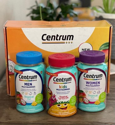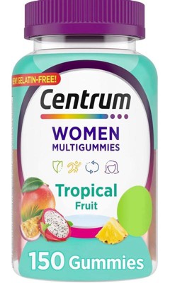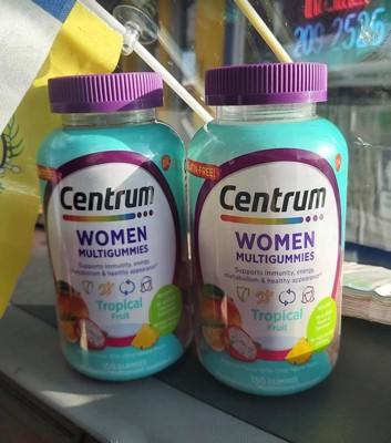 Centrum Women's Multivitamin Gummies are formulated with essential vitamins and minerals in a delicious, tropical fruit flavor. These gummy vitamins are specially crafted to support women's immunity, energy, metabolism and healthy appearance (1). Women's Centrum multigummies are packed with 11 essential nutrients, including B-Vitamins to support daily energy needs and aid in the metabolism of fats, carbohydrates and proteins, as well as Vitamins C and E for immune support and biotin, vitamins A, C and E to help maintain a healthy appearance (1). These great-tasting adult multivitamin gummies are vegetarian, Non-GMO (2), gluten free and gelatin free. These gummy multivitamins for women come in three deliciously distinct tropical fruit flavors: Pineapple Mango, Dragon Fruit and Passion Fruit. Each tasty flavor gives you high-quality nutrients your body may need with no high fructose corn syrup, synthetic dyes, or artificial flavors or sweeteners. They also feature a pectin base that is vegetarian. Just chew two women's gummies once daily with or without food to support immunity, energy, metabolism and a healthy appearance (1). These gummy vitamins for women come in a bottle of 100 gummies to keep you stocked for over a month.