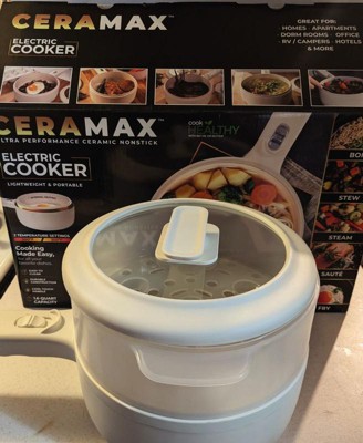 Ceramax Nonstick Electric Hot Pot Set Includes: electric skillet cooker pan with nonstick ceramic coated interior, tempered glass lid with stay cool handle, steamer insert tray.