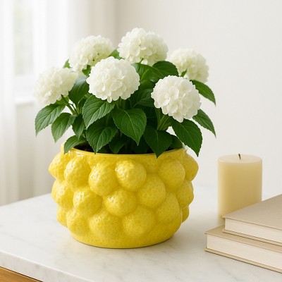 Brighten up your home or garden with this stylish yellow ceramic planter, designed to add a modern touch to any space. Crafted from high-quality stoneware, this planter is both durable and elegant, making it the perfect choice for displaying your favorite plants. The vibrant yellow color combined with a unique dotted texture creates an eye-catching focal point that complements various decor styles. Measuring 8x8x9 inches, this planter is ideal for housing a variety of plants, including succulents, flowers, and indoor greenery. The sturdy wooden stand elevates the planter, providing better air circulation and stability while protecting surfaces from water damage. Whether placed in the living room, patio, balcony, or office, this ceramic planter enhances your space with its functional and decorative appeal. Its premium stoneware construction ensures long-lasting durability, while the wooden stand adds a natural and modern aesthetic. Perfect for plant lovers and home decorators, this planter is a must-have for anyone looking to incorporate greenery into their space effortlessly. Elevate your plant display with this elegant ceramic planter and bring a fresh, stylish look to your home today.