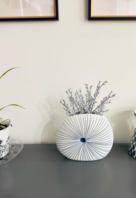 Ceramic Decorative Vase with Dotted Circular Detailing - Contemporary Curved Profile for Artistic Accent - Home and Office Decor - 9" White & Blue