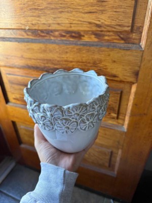 [This review was collected as part of a promotion.] This floral planter is so pretty. It’s a good, heavy duty material that will definitely shatter if dropped. Nice size and beautifully detailed design