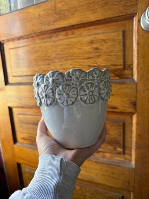 Stoneware Ceramic Planter with Embossed Floral Rim and Curved Edge Detailing for Decorative Display and Contemporary Accent Styling