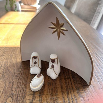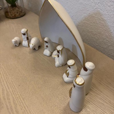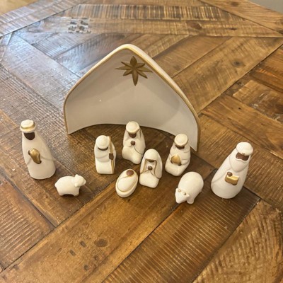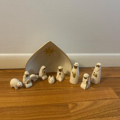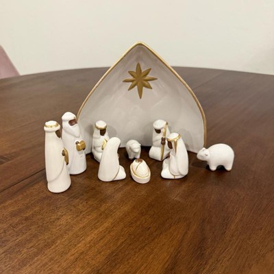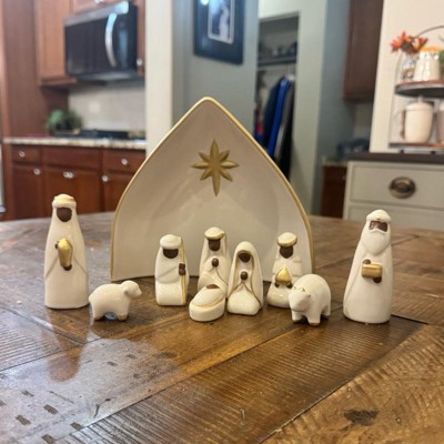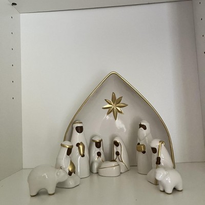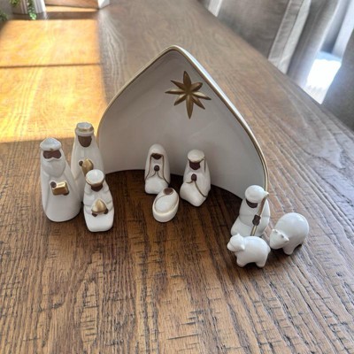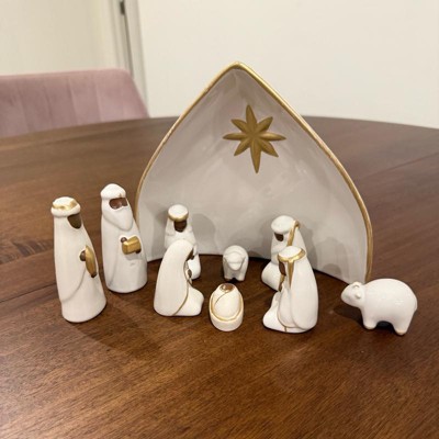 Bring festive joy and serenity to your home with this 10-Piece Nativity Set from Threshold™. This nativity set features nine ceramic figures in white with gold-tone detailing along with a manger engraved with the Christmas star for an iconic depiction of the Christmas story. Designed for indoor use only, you can place this nativity set on any flat surface to elevate your holiday decor.