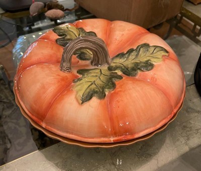 Thank you for your review on our Harvest Fileds 3-D Pumpkin Covered pie carrier! We can't keep this item on our shelves!! It is such a unique item! It's a perfect decorative home decor item as well as a funcitonal carrier! So festive and fun! We have a slew of matching 3-D items in this collection. We hope you will shop all of our Harvest Fields dinnerware & serveware for a truly authentic harvest tablescape!! Enjoy!