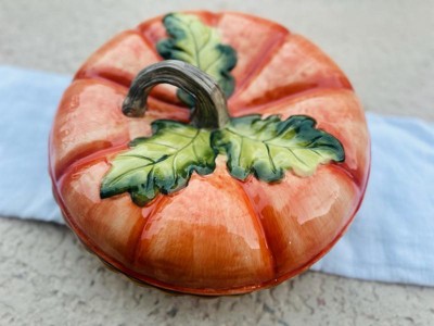 [This review was collected as part of a promotion.] The Harvest Fields 3-D Pumpkin Covered Pie Carrier is perfect for fall holidays and even decoration. It’s well built and colorful, with enough room for a large pie. The ceramic material is strong as well. A nice piece of holiday dinnerware.