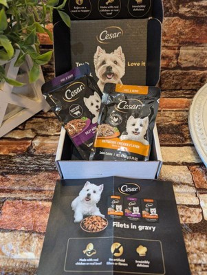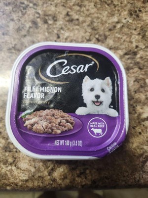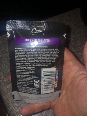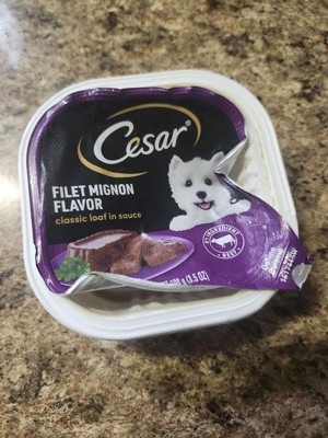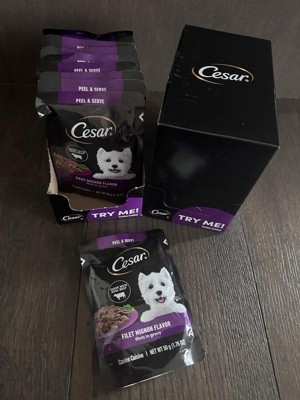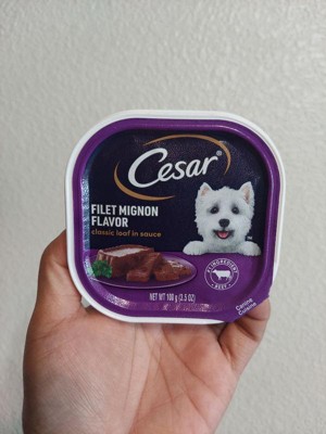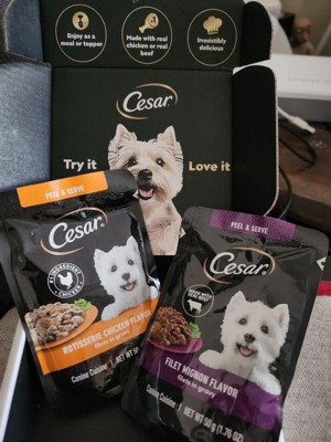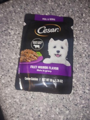 I purchased the Cesar in the flavor filet mignon dog food fillets with gravy for my rescued red nose Pitbull part Shar Pei. I know this is a tiny little pack of dog food, but I needed a dog food topper for her dry kibble. I bought her a 44 lb bag of lamb kibble from a different company, and she got extremely picky and did not want to eat it, so I decided to add some flavors. Thankfully, she has been eating all of her dish as long as I top it with this rotisserie chicken fillets and gravy. This is a easy open convenient little pack of dog food. I'm so glad I was able to find something that my dog will eat.
