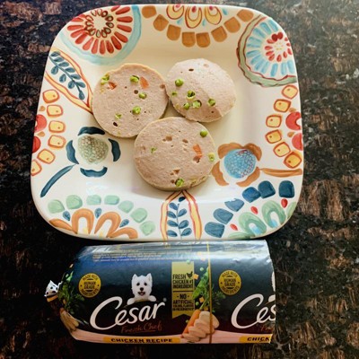 [This review was collected as part of a promotion.] My mini pin loves this Cesar - Fresh Chef Chicken Recipe Roll dog food. As soon as she sees me pull it out of the fridge she goes wild. I like that this dog food is full of healthy ingredients. You can even see pees and pieces of carrot in the slices. This food is new to my dog but I can already see such a positive change in her. She really looks forward to feeding time now. I like that this doesn’t break the bank. This is easy to recommend.