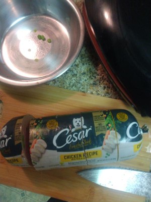 [This review was collected as part of a promotion.] My dog has never eaten anything like this, so I was pretty worried he wouldn't want much to do with it. Boy was I dead wrong! He loved the Cesar Fresh Chef Chicken and Beef roll. It's also a great price especially considering how much his bagged food is and this is fresh and so much better for him. You should see him go after it though! Nothing like how he goes for his dry or even wet food. The only problem I had was finding it. I just kept looking and eventually found it and I'm so glad I did because he loves this food. It has whole peas and pieces of carrots you can actually look and tell, "Hey, that's a carrot!" You just take the roll and cut off however much you wish to feed them and I cut up the slab to make it easier for him to break it up but it's not hard or anything. I just use it as a side to his dry food while I'm feeding the cats their wet food so he doesn't feel left out and he thinks he is IT! He has his own stuff the cats can't have and he loves it. I think this will be a new weekly purchase from now on due to how much he loves it. It makes me feel good that I'm feeding him healthier more natural food and seeing how happy it makes him is just the icing on the cake.