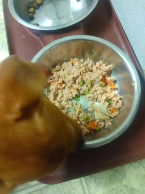 [This review was collected as part of a promotion.] My picky little doggie loved this food! I was so happy when I watched her clean the plate of her food. What really makes me happy is the fresh and REAL ingredients. This is made with clean and healthy ingredients with some veggies in there too! It's so convenient to slice a serving off the roll. After I put it on the plate, I warm it up for a few seconds in the microwave and my dog eats the entire portion in less than a minute!