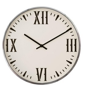This sleek and modern 20" round wall clock features bold black Roman numerals printed against a crisp white background, creating a clean and stylish look that enhances any home décor. Its lightweight yet durable chrome plastic frame and clear glass cover offer an easy-to-read analog display. Powered by reliable quartz movement, the clock ensures accurate timekeeping with a non-ticking mechanism for quiet, comfortable environments. With no assembly required, simply insert one AA battery (not included) and enjoy a hassle-free, decorative upgrade to your wall.