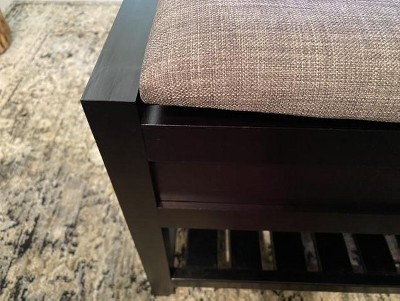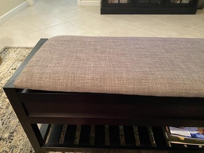 Bring comfort and functionality to your entryway with the Rouen Seating Bench with Shoe Storage. Featuring a padded gray fabric seat atop a rich espresso-finished frame, this bench offers a cozy spot to sit while keeping your space organized. Lift the cushioned seat to reveal hidden storage, and use the lower slatted shelf for shoes, boxes, or other essentials. With its versatile transitional design, it blends seamlessly with any décor.
