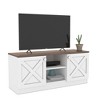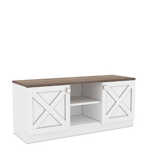 Bring a touch of coastal charm to your living room with this vintage-inspired TV stand. Featuring a warm wood top, crisp white base, and farmhouse-style cupboard doors, it combines elegance with functionality. Designed to accommodate TVs up to 89 inches, it provides ample space for all your entertainment needs with two side cupboards and a central open shelf.