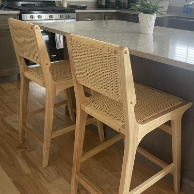 Instantly take your kitchen counter to the next level with this Ceylon Woven Counter-Height Barstool from Threshold™. This wooden counter-height barstool features a woven seat and built-in footrest to offer a comfortable seating experience, while the simple design blends effortlessly with any decor style and color palette. With an armless construction and slightly flared legs, you can pair this barstool with matching pieces to create a cohesive look for casual entertaining.