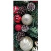 - Decorated with pine cones and red and gold balls