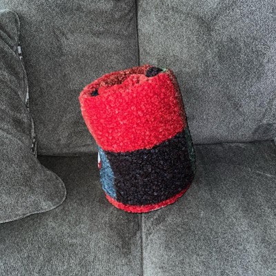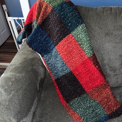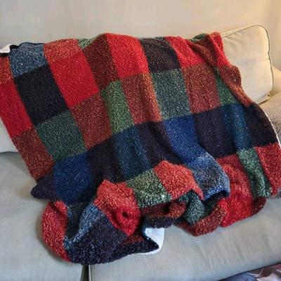 Add a touch of warmth and style to your decor with this Chalet Plaid Printed Boucle Throw Blanket from Room Essentials™. This rectangular throw blanket showcases a fuzzy boucle surface adorned with a vibrant chalet plaid pattern in red, green, blue and brown, contrasting with an off-white reverse for added depth and dimension, Made from 100% recycled polyester fabric, the lightweight throw blanket is also machine washable for effortless cleaning.