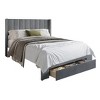 This platform bed frame blends classic style with everyday function. Perfect for compact or refined spaces, it features a wingback headboard with modern channeled tufting and nailhead trim for a sophisticated look. A spacious drawer at the footboard offers convenient storage to help keep your room tidy and organized. Crafted from solid wood and padded with plush foam, the frame is upholstered in soft, skin-friendly velvet for a luxurious feel. Twelve sturdy wooden slats provide strong mattress support, eliminating the need for a box spring. Ships in one box for easy delivery and hassle-free assembly. Available in Twin, Full, Queen, and King sizes, and offered in three timeless colors to suit any bedroom décor.