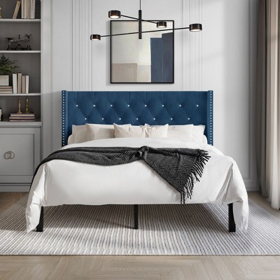 Transform your bedroom with the timeless elegance of our luxurious wingback platform bed. The tall headboard showcases striking diamond-shaped button tufting, bringing a sense of refinement and classic style to your space. Designed with a wingback silhouette and upholstered in soft, durable 100% polyester velvet fabric, this bed offers both visual appeal and long-lasting comfort. Practicality meets style with four spacious slide-out metal drawers on the sides—ideal for neatly organizing your everyday essentials. Built from a sturdy blend of solid rubberwood, MDF, and LVL, the frame is made to stand the test of time. This platform-style bed removes the need for a box spring, streamlining your setup. Available in rich Black, elegant Navy Blue, and versatile Light Grey, you can choose the perfect color to match your bedroom décor. The bed ships in one convenient box, and easy-to-follow instructions make assembly quick and hassle-free.
